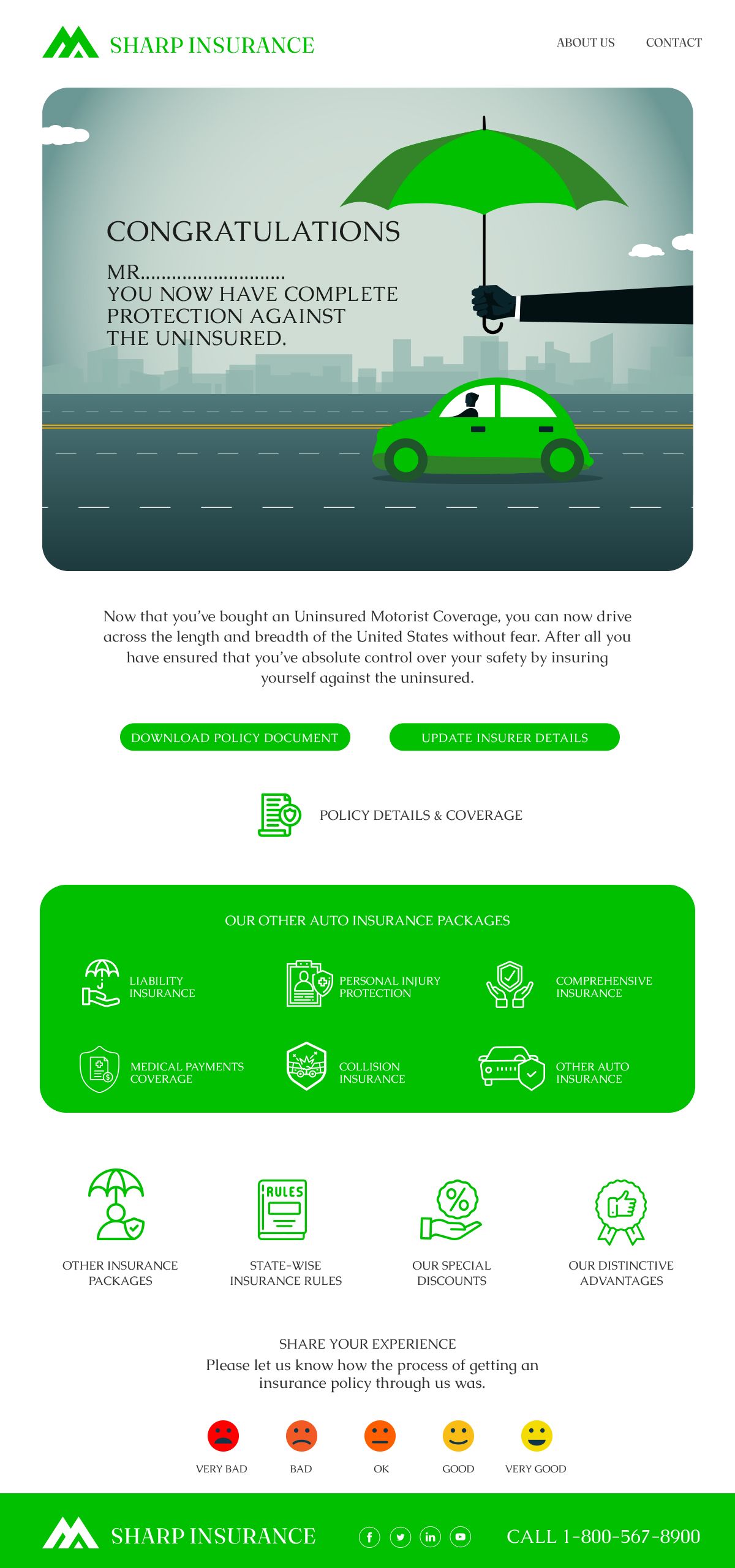 Greet your customer with a warm welcome message - and an affirmation that they are protected against uninsured motorists. You can incorporate a video on the page to help customers understand the details of their policy. Enhance your customer care and engagement with this single-point digital policy landing page.